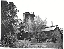 In 1891, Col. Potts began building a nearby chateau-like mansion, "Langoma" (1891–95, Theophilus P. Chandler Jr., architect),[15] which he intended as a residence for himself and his son William.[16] However, he died in December 1893 and did not live to see it completed. William, his wife, and mother did move into "Langoma", but ironmaking at the furnace ended in April 1894, not long after Col. Potts' death. It was the last iron furnace operating in Chester County.[3] The furnace and railroad spur were left largely intact, although unused. The slow dilapidation of the furnace produced a remarkable aesthetic effect. Henry Seidel Canby referred in 1935 to "its moldering cupola furnace, like a Persian mosque of the twelfth century, its long walls and sleepy half-drained dam."[17] This slow decay was accelerated after the death of William M. Potts in 1943, when the railroad was taken up and other metal was reclaimed for scrap. Even after this, HABS photographer Ned Goode said of the furnace in 1959 that "its wild setting in an over-grown field is quite striking".[3]