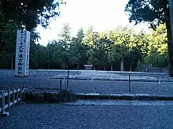 The empty site beside the shrine building, the site where the previous shrine once stood and where the next will be built, is called the kodenchi. This area is strewn with large white pebbles and is left totally empty apart from the oi-ya, a small wooden hut containing a wooden pole a little over 2 metres in height called the shin-no-mihashira (new sacred central pole). When a new shrine is built, it is built around the sacred central pole before the removal of the oi-ya, so that the central pole is never seen. The central pole of the old shrine will then have a new oi-ya erected so that the shin-no-mihashira also remains unseen.[10]