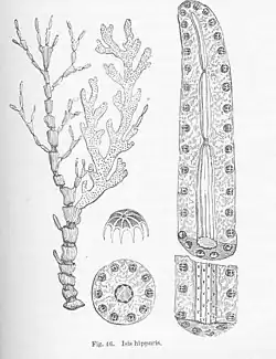 Isis hippuris, also known as sea bamboo (though this common name is ambiguous), is a species of bamboo coral found in the Western Pacific Ocean, commonly near the coasts of Indonesia.[2] I. hippuris reproduce asexually, and is abundant throughout its habitats in Indonesia. For centuries, I. hippuris has been identified by its bamboo or bony-looking structure. Additionally, it is notable for producing Hippuristanol, a molecule that could potentially have anti-cancer applications. While no actual conclusion regarding Hippuristanol in I. hippuris has been published, scientists and marine biologists continue to study how the molecule could be used in cancer research and recovery.[3] Although only found in the Western Pacific Ocean, I. hippuris is highly sought after across the globe, and is seen as a symbol of beauty.[4]
