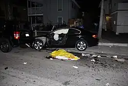 Rodger then drove to Del Playa Drive, where he saw a sheriff's deputy and fired shots. As he sped away, the deputy returned fire, discharging a single round.[122][123][124] Rodger then struck two men with his car,[125][126][127][128] driving to Camino Del Sur where he shot a man in the right forearm and right buttocks. Rodger proceeded to Sabado Tarde Road, hitting a male cyclist and two male skateboarders. He encountered two men in a driveway and shot them several times.[5][93][124][129] Near Little Acorn Park, Rodger saw four sheriff's deputies, engaged three of them in a shootout, and received a gunshot wound to his hip.[130][131][132] At around 9:35 p.m., Rodger turned onto several streets, put the gun to his head, and pulled the trigger,[51] causing his car to veer and hit a male cyclist, who tumbled on the vehicle and damaged the car's windshield. Rodger's car eventually crashed into a parked vehicle.[74][133] As police officers surrounded Rodger's car, they mistakenly handcuffed the injured cyclist, initially suspecting him to be a second assailant. Realizing their error, they gave him medical attention, acknowledging him as a victim.[134][135][136] Upon searching Rodger's vehicle, police discovered his body and found a gunshot wound to his head.[n]