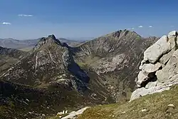 The largest glen on the island is Glen Iorsa to the west, whilst narrow Glen Sannox (Gaelic: Gleann Shannaig) and Glen Rosa (Gaelic: Gleann Ròsa) to the east surround Goat Fell. The terrain to the south is less mountainous, although a considerable portion of the interior lies above 350 metres (1,150 ft), and A' Chruach reaches 512 metres (1,680 ft) at its summit.[18][19] There are two other Marilyns in the south, Tighvein and Mullach Mòr (Holy Island).