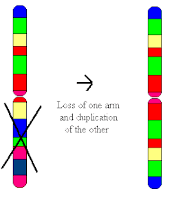 An isochromosome is an unbalanced structural abnormality in which the arms of the chromosome are mirror images of each other.[1] The chromosome consists of two copies of either the long (q) arm or the short (p) arm because isochromosome formation is equivalent to a simultaneous duplication and deletion of genetic material. Consequently, there is partial trisomy of the genes present in the isochromosome and partial monosomy of the genes in the lost arm.[2]