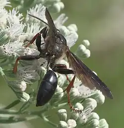 Isodontia auripes, the brown-legged grass-carrier, is a species of thread-waisted wasp in the family Sphecidae.[1][2][3][4] The wasp will opportunistically use old nests made by Xylocopa virginica or mining bees. Larvae eat for three days and then spend two forming pupae. Oecanthus is a common prey item throughout I. auripes' range. [5] I. auripes lives along the east coast of the United States.[2]