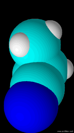 Scientists were able to observe transitions in both types of cyanides. Thus, the microwave spectrum of the isobutyronitrile has been recorded from 26.5 to 40.0 GHz. Three different excited states were found in the R-branch of i-PrCN. In the experiments carried out by the scientists, different parameters were studied: The bond distance between the different atoms and the angles between them. The results indicated that the bond distance between de carbon atom and the cyano group is 1.501 Å; the angle between the three carbon atoms is 113º while the angle between the CCC and the CN bond is 53.8º. Two different torsional modes were observed, according to the relative intensities of the excited state lines, the frequencies of which were, respectively, 200±20 and 249±10 cm−1. This could give an idea of the internal rotation energy of this molecule, which has been found to be of 3.3 Kcal/mole.[8]