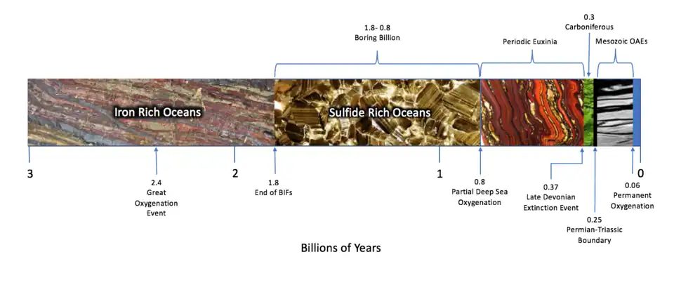 While euxinic conditions are rare today, In the early history of the Earth, these conditions were thought to be present in all oceans at depths of about 100 m (330 ft). The detection of isorenieratene and green sulfur bacteria in the mid-Proterozoic has been used as evidence for the long-term euxinic conditions remaining in oceans after the Great Oxygenation Event. For example, the 1.64-Gyr-old Barney Creek Formation in northern Australia hosts many biomarkers, including isorenieratene, that signify that these rocks were deposited in a marine basin with anoxic, sulphidic, and highly-stratified deep waters with colonies of green and purple sulfur bacteria.[14]