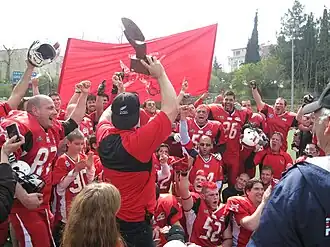 The Tel Aviv-Jaffa Sabres celebrate their Israel Bowl V victory. QB Adi Hakami holds the Becker Trophy.