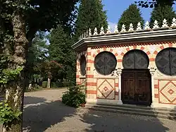 On 5 July 1865, the Jewish community, which at that time numbered 30 members, noted the acquisition of a field to use as a cemetery.[12][13] On 31 May 1866 it was inaugurated on occasion of the first funeral of a Jewish woman by the Lengnau Rabbi Dr. Meyer Kayserling. In 1892 a cemetery hall was built in the so-called Moorish style. After several expansions, a large second site was bought in 1916, and today the cemetery area comprises 0.17354 hectares (0.43 acres). Since the installation of the second cemetery in 1952, fewer and fewer burials were done at the very first Jewish cemetery in Zürich since the 14th century. Notable interments include Felix Salten (1860-1945), Joseph Schmidt (1904-1942) and Otto Klemperer (1885-1973).[14]