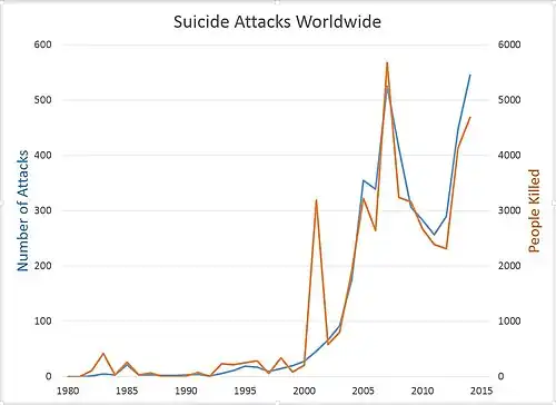 - ^ Number of suicide attacks and deaths from attacks 1982–2014 (most, but not all, of which were by Muslims). From Chicago Project on Security and Terrorism Suicide Attack Database