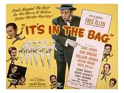 It's in the Bag! is a 1945 comedy film featuring Fred Allen in his only starring film role. The film was released by United Artists at a time when Allen was at the peak of his fame as one of the most popular radio comedians. The film has been preserved by UCLA Film & Television Archive.[2] The film is loosely based on the comic novel The Twelve Chairs (1928) of Ilf and Petrov, later filmed by Mel Brooks as The Twelve Chairs (1970). The team of screenwriters included Jay Dratler, Alma Reville, and Morrie Ryskind. Allen's encounter with Jack Benny in the film is notable as at this time they were involved in a famous 'feud', which ran for over a decade.