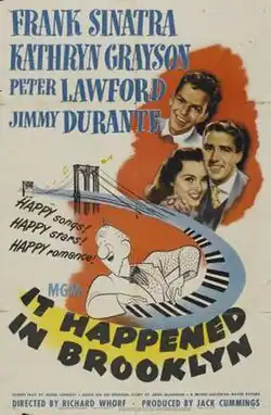 It Happened in Brooklyn is a 1947 American musical romantic comedy film directed by Richard Whorf and starring Frank Sinatra, Kathryn Grayson, Peter Lawford and Jimmy Durante, and featuring Gloria Grahame and Marcy McGuire. It Happened in Brooklyn was Sinatra's third film for Metro-Goldwyn-Mayer, which had purchased his contract from RKO (because Louis B. Mayer was a huge Sinatra fan).[2]