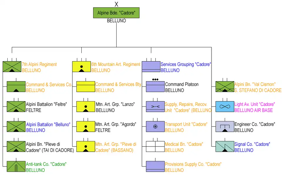 - in five cases a brigade with the same name existed (i.e. 7th Artillery Regiment "Cremona" - Motorized Brigade "Cremona", 35th Artillery Regiment "Friuli" - Motorized Brigade "Friuli").
