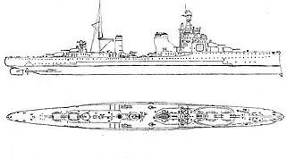 In the aftermath of World War I, the Italian Regia Marina (Royal Navy) received a group of light cruisers from the defeated German and Austro-Hungarian fleets. At the time, the Italian naval command was satisfied with these vessels as a supplement to their existing scout cruisers in the immediate postwar era. After the French Navy began building twelve large destroyers of the Chacal and Guépard classes, the Italian command responded by ordering the four Giussano-class cruisers.[1] The Giussanos were intended to overpower the new French destroyers with superior armament and very high speed at the expense of most armor protection.[2]