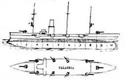 Calabria was designed by the Chief Engineer, Edoardo Masdea, and was intended for overseas service in the Italian colonial empire. She had a steel hull sheathed with wood and zinc to protect it from fouling during lengthy deployments abroad, where shipyard facilities would not be readily available. The hull was 76 meters (249 ft 4 in) long between perpendiculars and 81 m (265 ft 9 in) long overall. She had a beam of 12.71 m (41 ft 8 in) and a draft of 5.05 m (16 ft 7 in). Her normal displacement was 2,453 long tons (2,492 t) but increased to 2,660 long tons (2,700 t) at full load. She had a flush deck and a ram bow; her superstructure was fairly minimal, consisting primarily of a small conning tower forward. She was fitted with three pole masts for signaling and spotting purposes. Calabria had a crew of between 214 and 254 officers and enlisted crew.[1][2]