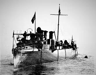 In January 1912 Garibaldino, her sister ship Artigliere, and the protected cruiser Piemonte deployed to the Red Sea to search for Ottoman ships along the coast.[8] On 7 January 1912 Artigliere came across a large group of Ottoman ships – the gunboats Ayintag (or Antep),[9] Bafra,[10] Gökçedağ,[11] Kastamonu,[12] Ordu,[13] and Refahiye,[14] the armed tug Muha, and the armed steam yacht Şipka[15] (formerly Fuad, Fauwette, or Fouvette) — in the harbor at Kunfuda on the coast of the Arabian Peninsula. The Ottoman vessels moved to attack Artigliere, and Garibaldino and Piemonte rushed to her aid. The ensuing clash, the Battle of Kunfuda Bay, lasted for three hours. Opening fire at a range of 4,500 metres (4,900 yd), the Italians sank three of the gunboats and forced the other three to beach themselves to avoid sinking, their crews fleeing after reaching shore. Sources do not mention the fate of Muha. On 8 January, the Italian ships returned and put ashore landing parties which completed the destruction of the beached gunboats after salvaging guns and trophies from them. The ships then bombarded Kunfuda and captured four Arab dhows. After the Ottoman troops in the area fled, a landing party from Piemonte occupied the town. Sources are unclear as to whether Şipka sank or remained afloat during the events of 7–8 January, but agree that the Italians seized her as a prize, towed her to Massawa, and later took her to Italy, where she was incorporated into the Regia Marina as the gunboat Cunfuda.[8][16][17][18]