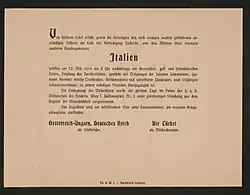 Anti-Italian leaflet distributed by the Austro-Hungarian government, mocking Italy's entry in the war by describing it as the day "Italy died".1915 - 4 May, In the midst of the Gorlice breakthrough, Salandra officially renounces the Triple Alliance in a note to Germany and Austria-Hungary. But on May 13, threatened without a majority in Parliament, Salandra resignes from office and orders Cadorna to stop mobilization.
