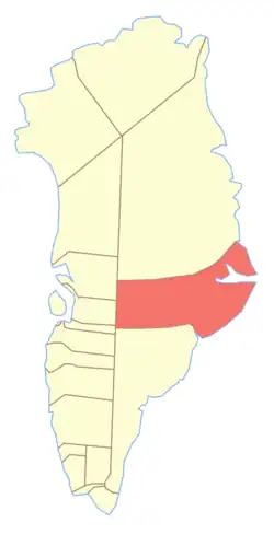Ittoqqortoormiit Municipality (Greenlandic pronunciation: [itːɔqːɔʁtɔːʁmiːt]) was one of the two municipalities of East Greenland. Since 1 January 2009 it has been incorporated into the Sermersooq municipality. It encompassed an area of 235,000 km2 (91,000 sq mi) along the Denmark Strait and the Greenland Sea. Before the creation of the Northeast Greenland National Park in 1974, the former municipality had been much bigger (935,000 km2), formally encompassing the largely uninhabited area to the north up to the border with Avannaa (North Greenland).
