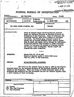 However, when Toguri tried to return to the U.S. a popular uproar ensued, prompting the Federal Bureau of Investigation to renew its investigation of her wartime activities. She was subsequently charged by the U.S. Attorney's Office with eight counts of treason, which were based on false testimony forced from witnesses by the prosecutors.[1][2] Her 1949 trial resulted in a conviction on one count, for which she served more than six years, out of a ten-year sentence in prison.