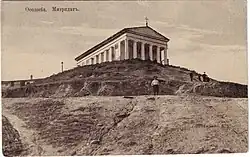 Aivazovsky died on 19 April (2 May in New Style) 1900 in Feodosia.[25] In accordance with his wishes, he was buried at the courtyard of St. Sargis Armenian Church.[44] A white marble sarcophagus was made by Italian sculptor L. Biogiolli in 1901.[45] A quote from Movses Khorenatsi's History of Armenia in Classical Armenian is engraved on his tombstone: Mahkanatsu tsneal anmah ziurn yishatak yetogh (Մահկանացու ծնեալ անմահ զիւրն յիշատակ եթող),[46] which translates: "He was born a mortal, left an immortal legacy"[44] or "Born as a mortal, left the immortal memory of himself".[47] The inscription beneath reads: "Professor Ivan Konstantinovich Aivazovsky 1817–1900" (Профессоръ Иванъ Константиновичъ АЙВАЗОВСКIЙ 1817–1900).