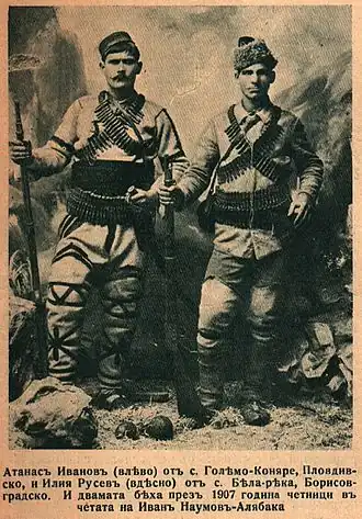 After the uprising, he went back to Bulgaria. In 1904, he was arrested in Sofia, together with Mamin Kolyu, after the unsuccessful attempt to murder the Turkish consul. They were arrested for six months because of this action in which the consul's bodyguard was wounded. Afterwards, he entered Macedonia again as a leader of a revolutionary band. When certain disagreements happened in the IMARO, he was among the supporters of Boris Sarafov.[6] As a leader of a revolutionary band, he toured the regions of Veles, Prilep, Kičevo and Porečje, but because of his conflict with Stefan Dimitrov, who was a leader of a revolutionary band operating in the Veles region, he was ordered not to return there. Ivan Naumov had battles not only with the Turkish military, but also with the Serbian armed propaganda. In 1904, his and Bobi Stoychev’s band were destroyed by the Turkish military, when 16 of his 20 freedom fighters were killed. The same year, a skirmish between his band and Stefan Dimitrov’s band occurred, but fortunately they agreed on the misunderstandings without causing casualties.