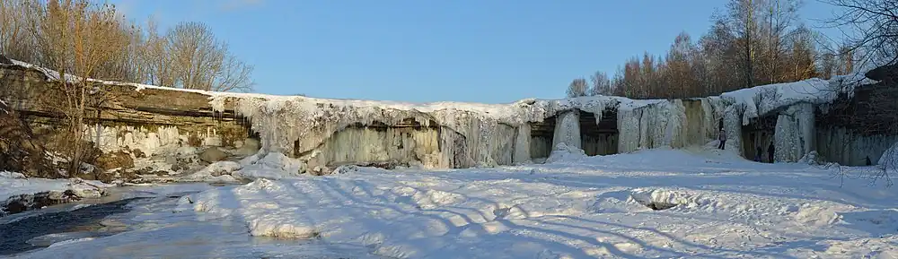 Jägala Waterfall[1][2][3] (Estonian: Jägala juga; English: /jɛɡælæ/) is a waterfall in northern Estonia on the Jägala River. It is the largest natural waterfall in Estonia, with a width of about 50 meters (160 ft) and a height of about 8 meters (26 ft).[4] Jägala Waterfall is located in Koogi in Harju County. Jägala Waterfall is also the most powerful waterfall in Estonia, cascading 12.8 cubic meters per second (450 cu ft/s) of water. It can even reach 200 cubic meters per second (7,100 cu ft/s) during spring in high water periods. Though, the cascade stops in the winter, freezing over.[5]
