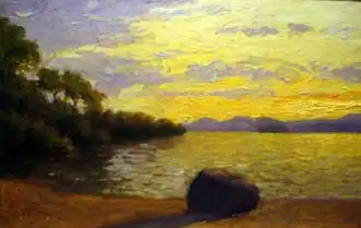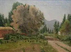 John B Fairbanks was born on December 27, 1855, in Payson, Utah. He was the first Latter-day Saint artist born in Utah territory.[2][3]: 49 His parents were John Boylston Fairbanks (1817-1875) and Sarah H. Van Wagoner Fairbanks (1822-1898).[4] His father was an early pioneer who had come to Utah from Winter Quarters in 1847;[5]: 38 and died from pneumonia on May 14, 1875, leaving Fairbanks to care for the family.[4] Although he showed an early interest in art, he had no inclination to pursue it as a career until, in 1877, he visited the studios of John Hafen, an aspiring artist his own age.[4] Fairbanks would sit in Hafen's studio and watch him paint in between working in the field and playing baseball. He would hide his paintings and other works, because he did not want to disappoint his family. When he eventually showed a finished painting to his mother, she initially did not believe he painted it, but was proud of Fairbanks when his sisters confirmed that he had painted it.[6]: 92 Hafen became his lifelong friend and mentor.[7] Fairbanks would paint in the evenings and Saturdays.[6]: 92
