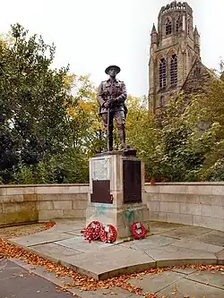 - War Memorial, Heaton Moor Road, Heaton, Stockport (1921); with the sculptor, John Cassidy; semicircular wall and plinth in Portland stone, on a base of sandstone flags, with a bronze statue (grade II)[17][31]