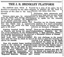 42. ^ '"The J. R. Brinkley Platform" (advertisement), Belleville (Kansas) Telescope, October 30, 1930, page 18.