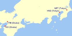 Japan Airlines (JAL) is a Japanese airline headquartered in Shinagawa, Tokyo. It is Japan's second-largest airline after All Nippon Airways (ANA) and has been considered the flag carrier of Japan due to its history. Its main hubs are Tokyo's Narita and Haneda airports, as well as secondary hubs in Osaka's Kansai and Itami airports. The JAL group, which includes Japan Airlines, also comprises J-Air, Japan Air Commuter, Japan Transocean Air, Hokkaido Air System, and Ryukyu Air Commuter for domestic feeder services, and JAL Cargo for cargo and mail services.