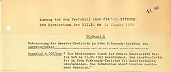 Excerpt from the protocol of a FU Berlin curatorium session concerned with the renaming of the "Amerika-Institut" to "John F. Kennedy- Institut für Amerikastudien" held on January 9, 1964. - to provide a broad group of minor students with the knowledge of American literature, history, social and cultural studies that will enable them to overcome the many preconceptions that make understanding the United States so excessively difficult and to acquire knowledge that is essential to a better understanding of the United States and the issues that affect it than has been the case in the past.[2]
