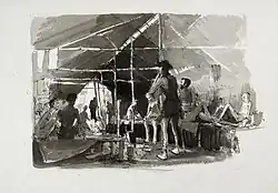 While serving in Singapore as a bombardier with the Royal Field Artillery in February 1942, Chalker was captured by the invading Japanese forces during the fall of Singapore. Chalker was held as a prisoner of war, first in Changi prison then two labour camps before being sent to work on the Burma Railway. On a part of the line in Kanchanaburi, Chalker used stolen paper and other materials to record the torture, malnutrition and illnesses endured by the prisoners. Although he risked being badly beaten, or worse, for doing so he managed to produce, and keep hidden, over one hundred paintings and drawings during his captivity between 1942 and 1945.[2] He met the Australian surgeon Colonel Edward Dunlop in 1944 and agreed, again at great personal risk, to make detailed records of the prisoner's medical conditions to help Dunlop in his work.[3] When released in 1945, Chalker spent some time at the Australian Army HQ in Bangkok working as an official war artist. Chalker's works, together with those of fellow POW artists Philip Meninsky, Ashley George Old and Ronald Searle form a unique record of prisoners' suffering during the building of the railway and were used in evidence at the subsequent Tokyo War Crimes Tribunal.[2] Many of these paintings are now located at the Australian War Memorial and the Imperial War Museum.[3] In 1995 an exhibition of the works of the four artists was held at the State Library of Victoria under the title 'The Major Arthur Moon Collection'.