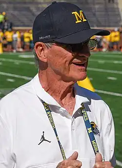 Following his son Jim's three-game suspension in 2023, Harbaugh unretired to serve as an assistant head coach for Michigan, and would wind up winning the 2024 College Football Playoff National Championship alongside his son.[9][10]