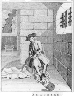 By this time, Sheppard was a hero to a segment of the population, being a cockney, non-violent, handsome and seemingly able to escape punishment for his crimes at will. He spent a few days out of London, visiting a friend's family in Chipping Warden in Northamptonshire, but was soon back in town.[24] He evaded capture by Wild and his men but was arrested again on 9 September by a posse from Newgate as he hid on Finchley Common,[25] and returned to the condemned cell at Newgate. His fame had increased with each escape, and he was visited in prison by various people. His plans to escape during September were thwarted twice when the guards found files and other tools in his cell, and he was transferred to a strong-room in Newgate known as the "Castle", put in leg irons, and chained to two metal staples in the floor to prevent further escape attempts.[26] After demonstrating to his gaolers that these measures were insufficient, by showing them how he could use a small nail to unlock the horse padlock at will, he was bound more tightly and handcuffed. In his History, Defoe reports that Sheppard made light of his predicament, joking that "I am the Sheppard, and all the Gaolers in the Town are my Flock, and I cannot stir into the Country, but they are all at my Heels Baughing after me".[8]