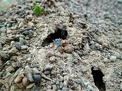 Jack jumper ants live in open habitats, such as damp areas, forests, pastures, gardens, and lawns, preferring fine gravel and sandy soil.[1][40] Colonies can also be spotted around light bushland. Their preferred natural habitats include woodlands, dry open forests, grasslands, and rural areas, and less common in urban areas.[26][40][41] Their nests are mounds built from finely granular gravel, soil, and pebbles, measuring 20 to 60 cm (8 to 24 in) in diameter and can be as tall as 0.5 m (20 in) in height.[42][43] Two types of nests for this species have been described, one being a simple nest with a noticeable shaft inside, the other being a complex structure surrounded by a mound.[44] These ants use the sun's warmth by decorating their nests with dry materials that heat in a quick duration, providing the nest with solar energy traps.[4][45] They decorate their nests with seeds, soil, charcoal, stones, sticks, and even small invertebrate corpses. They also camouflage their nests by covering them with leaf litter, debris, and long grass.[44] Nests can be found hidden under rocks, where queens most likely form their colonies, or around small piles of gravel, instead.[46] Their range in southern Australia, like other regional ant species, appears like that of a relict ant. Jack jumpers have been found in dry sclerophyll forests, at elevations ranging from 121 to 1,432 m (397 to 4,698 ft), averaging 1,001 m (3,284 ft).[47] Rove beetles in the genus Heterothops generally thrive in jack jumper nests and raise their brood within their chambers,[48] and skinks have been found in some nests.[49]