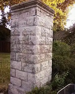 The stone monuments included embedded Jackson Square name plaques, along with appropriate street name plaques on two sides. They were also capped with orbs. Today, only one monument remains standing; it is on the southwest corner of Edith and 300 East, though the original orb is missing. The base of another pillar can be found on the southeast corner of Hampton and 200 East.