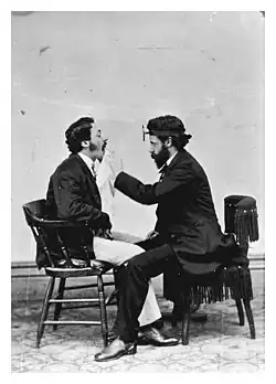 ![]() Jacob da Silva Solis-Cohen (right), shown examining a patient (Photograph circa 1868, courtesy of Thomas Jefferson University Archives and Special Collections, Scott Memorial Library, Philadelphia.) | |