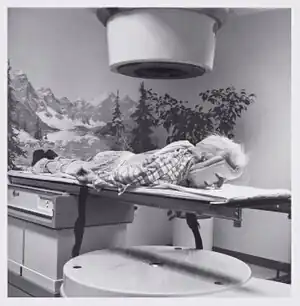 Critics situated Thurston's subsequent "Vital Signs" series within a newly developing photographic genre—"psychological documentary"—which explored interior experience (of artist and subject), in this case through everyday hospital and clinic situations involving birth, death and survival.[4][1] They portrayed patients and procedures with a quiet clarity, fragility and directness that writers described as honest and sometimes chilling (e.g., Radiation Treatment, 1976, an image of a patient lying on his stomach with a horror-movie-like mask covering the face).[1][14][13][2] Small in size (some only 4" square), yet striking for their staging, attention to gesture, ordered compositions and lighting, these images were noted by Artweek's Dorothy Burkhart for a "jewel-like quality reminiscent of the Flemish miniaturist Jan van Eyck"; also noted was an aura-like effect that suggested a mystical force beyond the edges of the images.[1][14][4] In the series' 1970s showings, reviews identified themes of vulnerability, hope, compassion and a wonder at modern technology's capacity to heal and sustain life.[1][14][2] Exhibited at the San Jose Museum of Art three decades later, the series was interpreted as expressing disquiet at the submission of bodies to medical machinery that might seem foreign, even unsympathetic to human suffering.[2][14]