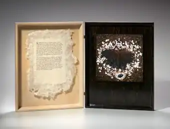In the 1990s Thurston's interest in poetry played an increasing role, leading to collaborative performances sponsored by Stanford's Center for Computer Research in Acoustics and Music and a body of small-scale sculptural objects pairing her own verse with her photographic prints.[7][10] The "Cycle of Songs" series (Montalvo Art Center, 1999) was a ten-year exploration of the feminine spirit embodied in the natural world.[9] It consisted of "photo-objects" combining color Cibachrome images of carefully lit tableaux and original poems letterpress printed on handmade paper in handcrafted wooden containers that like Russian icons could be ritualistically opened and closed.[7][31][10] Song of the Shaman and Song of the Bear focused on the element of earth and explored shamanic women in touch with the primal forces of nature; Song of the Moon featured an arrangement of iridescent seashells on a shiny black background, a graphite sketch and a poem about the moon's changing influence.[10] Reviews compared the simple elegance of the photographs to Shaker furniture and Japanese temples, while noting the enigmatic and mythic quality of the imagery (textual and visual), which was drawn from dreams, memories and the talismanic qualities of the still-life objects.[7][10]