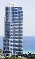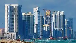Sunny Isles Beach had very few skyscrapers until the 2000s, when many were constructed on the east side of Collins Avenue, on the beach adjacent to the Atlantic Ocean.[5] This strip historically consisted of a row of low rise hotels known as "Motel Row", mostly developed midcentury in the MiMo architectural style.[6] Even among high-rises, the oldest such structures in the city only date to the 1960s.[7] The wall of skyscrapers spans nearly the entire length of the city longitudinally, from the Ritz-Carlton Residences located near the border of Haulover Park to the south to Regalia located adjacent to the border of Golden Beach to the north, which has strict single family residential zoning.