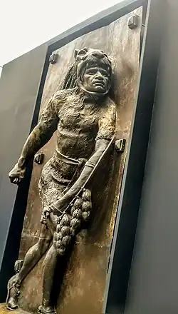 The jaguar motif was used due to the belief the jaguar represented Tezcatlipoca. Aztecs also wore this dress at war because they believed the animal's strengths would be given to them during battles.[4] Jaguar warriors were used at the battlefront in military campaigns. They were also used to capture prisoners for sacrifice to the Aztec gods.[2] Many statues and images (in pre-Columbian and post-Columbian codices) of these warriors have survived.[5] They fought with a wooden club, studded with obsidian volcanic glass blades, called a macuahuitl. They also used spears and atlatls.