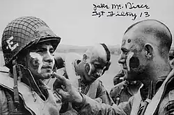 McNiece's deliberate disobedience and disrespect during training prevented him from being promoted past Private when most Paratroopers were promoted to Private First Class after 30 days. McNiece would act as section sergeant and first sergeant through various missions. His first sergeant and company commanders knew he was the man the regiment could count on during combat.[4] His escapades are documented in his words in The Filthy Thirteen, Fighting With the Filthy Thirteen, and War Paint: The Filthy Thirteen Jump Into Normandy.