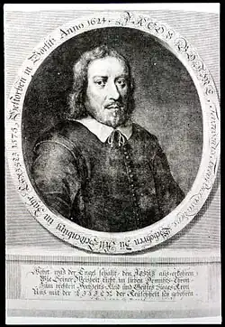 Jakob Böhme (/ˈbeɪmə, ˈboʊ-/;[2] German: [ˈbøːmə]; 24 April 1575 – 17 November 1624) was a German philosopher, Christian mystic, and Lutheran Protestant theologian. He was considered an original thinker by many of his contemporaries within the Lutheran tradition, and his first book, commonly known as Aurora, caused a great scandal. In contemporary English, his name may be spelled Jacob Boehme (retaining the older German spelling); in seventeenth-century England it was also spelled Behmen, approximating the contemporary English pronunciation of the German Böhme.