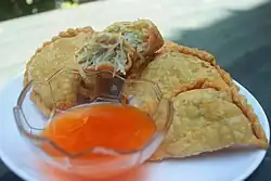 Jalangkote (Lontara: ᨍᨒᨃᨚᨈᨙ) is a South Sulawesi fried dumpling from Indonesian cuisine, stuffed with rice vermicelli, vegetables, potatoes and eggs. Spicy, sweet and sour sauce will be dipped into prior to be eaten.[1] A popular dish in Makassarese cuisine of the Makassarese and Buginese people, it is also a specialty of South Sulawesi, Indonesia. Jalangkote is similar to dishes such as pastel and panada.