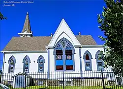 The church, built in 1900, is a Late Gothic Revival style, in a de-shingled Shingle Style with a steep slate gable roof. It features twelve large pointed arched windows and an 80-foot-tall (24 m), square bell tower. The church is the first building for its German-speaking congregation, founded in 1902.