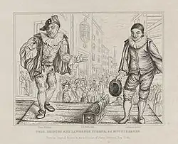 An oil caricature of Sterne by Thomas Bridges, painted as a double portrait with a caricature of Bridges by Sterne, was owned by Atkinson. It is known that Sterne in his part of the composite work followed closely an engraving The Infallible Mountebank, or Quack Doctor, an old broadside satirising Hans Buling, after Marcellus Laroon.[6][7] In 1761, before travelling to France, Sterne left behind details of the "lady" who was then owner of the oil portrait, with Elizabeth Montagu.[8]