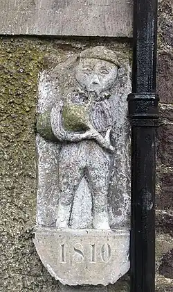 The destruction of the castle is mentioned in a contemporary political poem, Tom Truth's Rhime in Defence of the Queen of Scots.[36] The site at Skirling includes a low mound with a former moat and has been excavated by archaeologists, finds including a woman's leather shoe with pinking and slashing suggest occupation in the 15th- and 16th-centuries.[37] A stone carving of a piper set on a nearby house is said to have come from the castle.