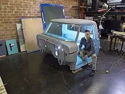 Georgopoulos explores ways to deconstruct the car in a non-traditional visual form so the viewer can appreciate the massive size and power of a car but in the confines of an interior space. The result is a 1:1 scale flat panel homage to the vintage automobile; made in the measurement specifications (length and width) of the manufacturer dimensions, giving the appearance of the car being flattened from above.