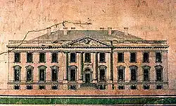 In July 1792, Hoban was named winner of the design competition for the White House.[9] His initial design resembled the Charlestown Courthouse with a three-story facade and nine bays across. Under Washington's influence, Hoban amended it to a two-story facade, 11 bays across, and, at Washington's insistence, the whole presidential mansion was faced with stone. It is unclear whether any of Hoban's surviving drawings are actually from the competition.[10]