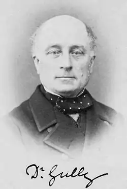 While Gully believed in the value of homeopathic medicines in some cases, adding a footnote about his positive experiences with homeopathy to later editions of his water-cure book and stating that "It is well and wise to observe and investigate these things before laughing at them”,[39] he seems to have regarded the use of homeopathic remedies as an adjunct to his use of hydrotherapy,[40] and does not appear to have agreed with the fundamental principles of homeopathy, writing in 1861, "It may shock the homœopathic world when I say that I never much cared for the doctrine of "like curing like"; and that I do not believe it to be of the universal application that they suppose".[41] Like many of his educated contemporaries both in the UK,[42] and in the USA[43] Gully showed an interest in several popular movements of the day, such as women's suffrage, mesmerism and diagnostic clairvoyance.[44] In later life he came to believe in spiritualism, being friend and protector to the medium Daniel Dunglas Home,[45] was present at some of the manifestations of "Katie King" with Sir William Crookes and was President of the British Spiritualist Association in 1874.[46]