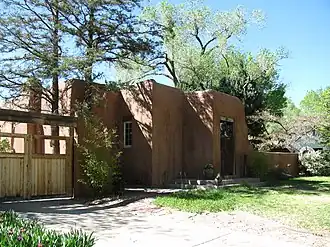 The house is notable as a fine example of the Pueblo Revival style architecture which was popular in Albuquerque during the interwar period. It is a one-story, L-shaped adobe building organized around a walled courtyard. The house is one room deep and has a portal or veranda, supported by corbelled wooden posts and vigas, along both sides of the courtyard. Two later additions were constructed at the rear of the house, a freestanding artist's studio, and a two-story addition which joined the studio to the main house.[3]