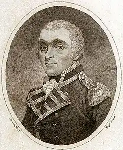 The outbreak of the French Revolutionary Wars in 1793 led to Dacres returning to sea aboard the 64-gun HMS Sceptre and taking part in the bombardment and capture of Fort Bizothen at Port-au-Prince.[1][6][7] His crew however suffered from high levels of sickness and Dacres was despatched back to Britain as a convoy escort. After his arrival he was appointed to command the 90-gun HMS Barfleur as part of the Channel Fleet under Lord Bridport.[8] He was present at the Battle of Groix on 23 June 1795, but was not actively engaged.[1][8]